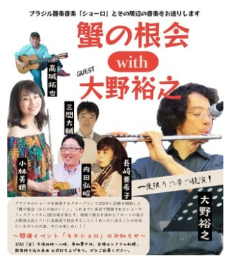 ショーロフェスティバルに二度の参加実績を持つ『蟹の根会』。今回のダイマライブは、東京から強力なゲスト=フルートの名手である大野裕之氏をお迎えしておとどけいたします。